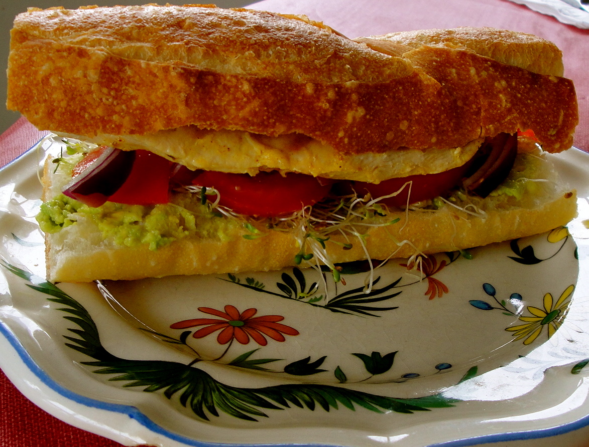 5) Now for the plating: smear avocado mixture onto the bottom layer of the baguette followed by a light layer of alfalfa sprouts. Put the sliced tomatoes and onions and the chicken breast on top.