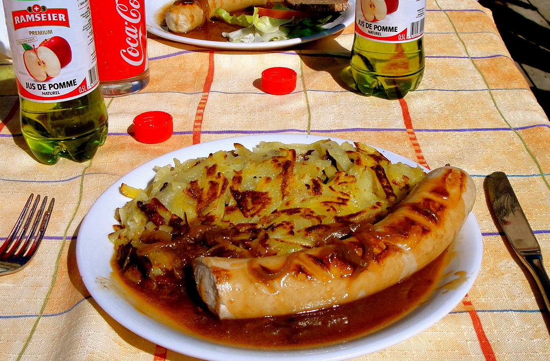 This delicious sausage came with an irresistible onion sauce (similar to a gravy, but way better) and rösti, a Swiss potato-like pancake made with coarsely grated potato which is pan fried to a crisp. I washed down this bad boy with carbonated apple juice, which I’m telling you, I got addicted to while in Switzerland. I don’t know why, but I have not found a drink that is as good as this Swiss bubbly. My attempt at mixing apple juice with seltzer water only resulted in a somewhat average-tasting beverage.