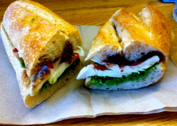This tasty sandwich might just be a black sheep – standing out from many mozzarella and tomato sandwiches I have eaten. Mozzarella, sun dried tomatoes, pesto and balsamic vinaigrette on fresh baguette bread is definitely my idea of an ideal lunch.