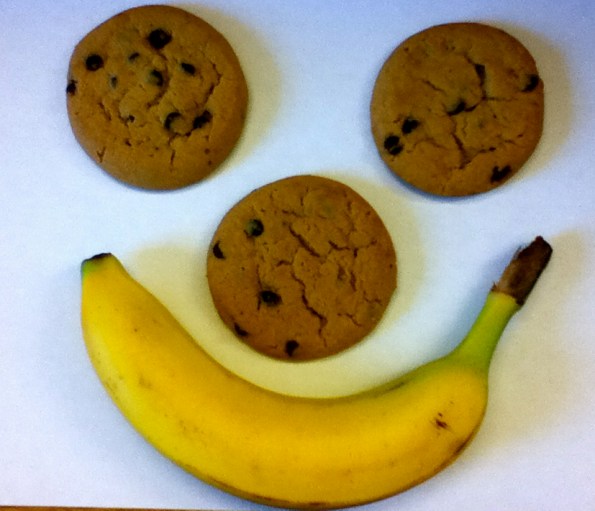 Chocolate chip cookies are my favorite type of cookie, so I was distraught last semester when I bit into one from the cafeteria, and it crumbled all over me. Sandy is the best word to describe its texture. As I painstakingly ate the cookie, I imagined it tasted like the pretend desserts I used to concoct as a little kid on the beach – pies, cakes, and cookies all made of sand. (Not that I ate these when I was a little kid). Today, they had chocolate chip cookies again, and I am glad to report these ones were normal tasting, hence the smiley face in the picture.