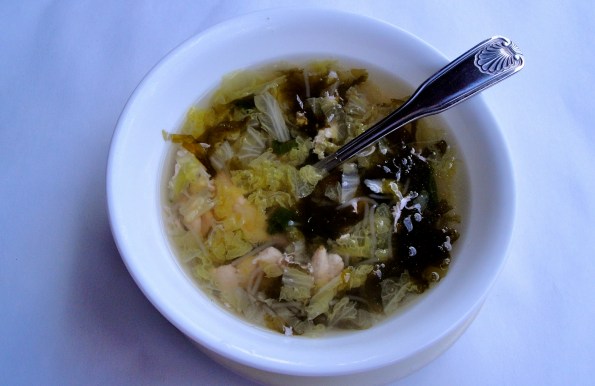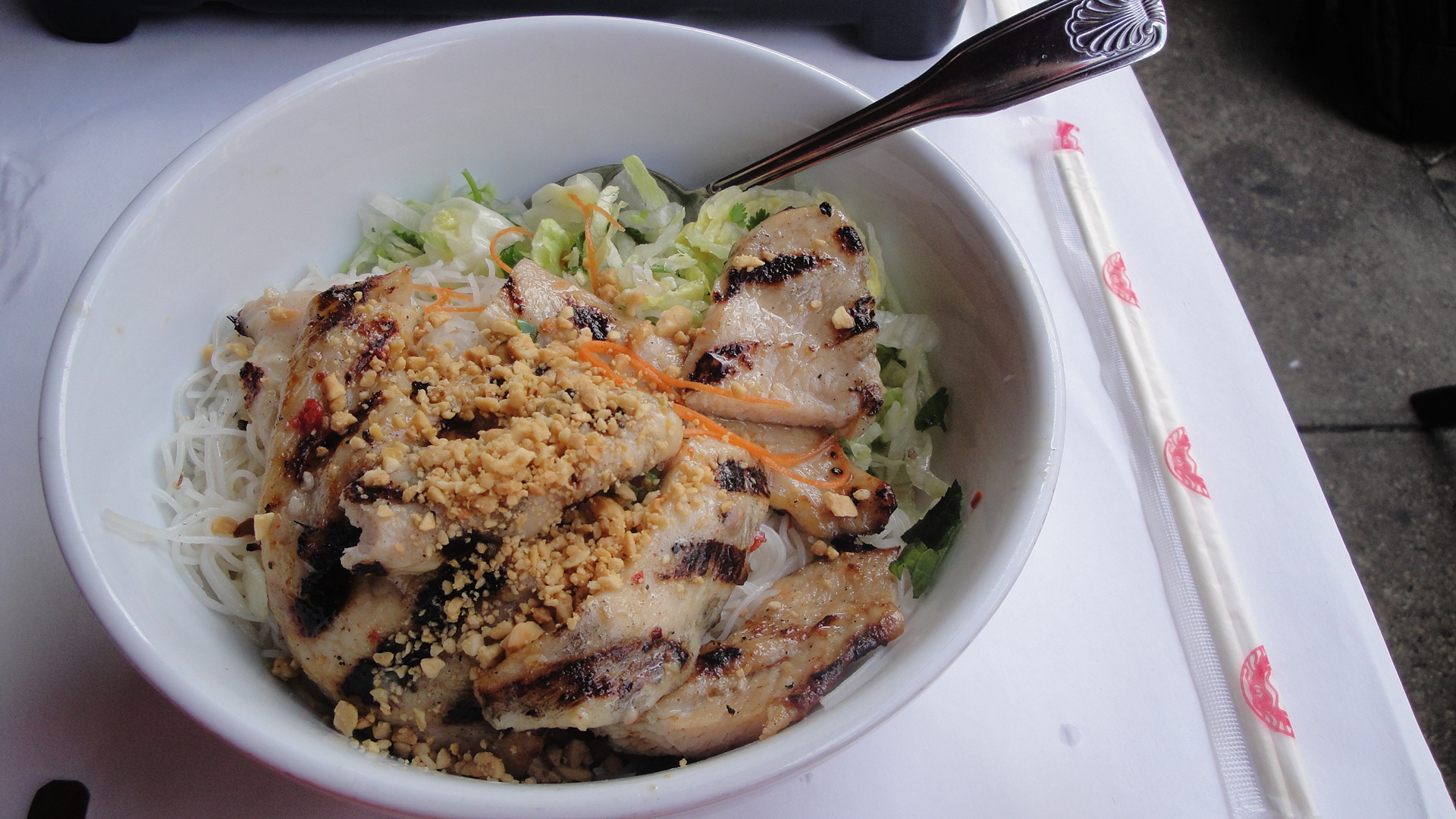 For lunch, my mom and I went to one of my haunts, a Vietnamese restaurant called Vermicelli. I love the food, and their lunch is pretty cheap. For around $8, I order a huge bowl of barbecue chicken with vermicelli (which I always finish). It comes with some sort of chicken soup which today had cabbage, kale, and egg white.