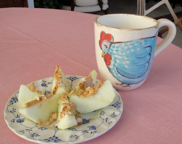 As if i didn’t have enough to eat, when I got home around 4PM, I made green tea in my new mug (isn’t the rooster adorable?) and had an apple with peanut butter and some of my leftover granola.