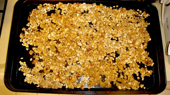 I measured roughly 3 cups of rolled oats and mixed in 1 handful of chopped walnuts and 1 handful of sliced almonds. Meanwhile, I heated 1/2 cup of honey in a pot with a teaspoon of Canola oil until the mixture came to a boil. I poured the honey and oil onto my oats and nuts mixture and tossed until well combined. Then I put my concoction on a sheet pan and into an oven that was preheated to 300 degrees Fahrenheit. I baked my granola for roughly 40 minutes, checking up on it every 10 minutes.