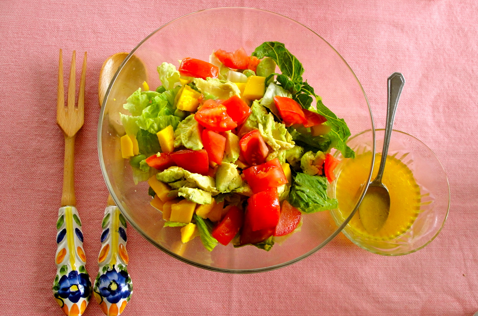For lunch today, I made a grilled cheese and one of my favorite salads: romaine with mango, avocado, and tomato. The colors from the mango and tomato remind me of a sunset, so I decided to call it the Sunset Salad. What makes this salad so special and perfect for the warm weather is my orange vinaigrette. I squeeze the juice from half a naval orange, and combine it with 2 teaspoons of cider vinegar, roughly 1/4 cup of olive oil, and a little salt and pepper.