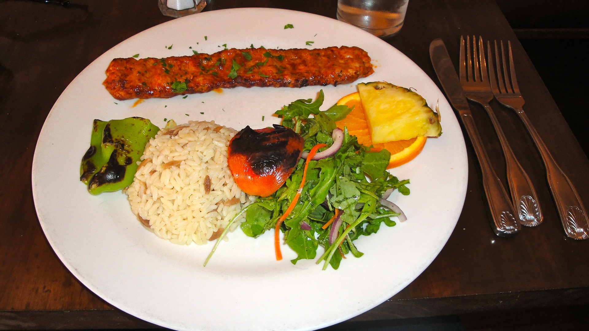 For lunch a couple of days ago, my mom and I ate at another Turkish restaurant which was also very good. They served us really good bread (a common theme I noticed in both Turkish restaurants). To start, I had red lentil soup (it did not look red, but it sure tasted good). And for my main course, I had some sort of chicken sausage. I usually wouldn’t order sausage in a restaurant because it’s not one of my favorite foods to begin with. But this sausage was very good, and it came with rice pilaf and arugula salad. Now, all I need is some baklava.