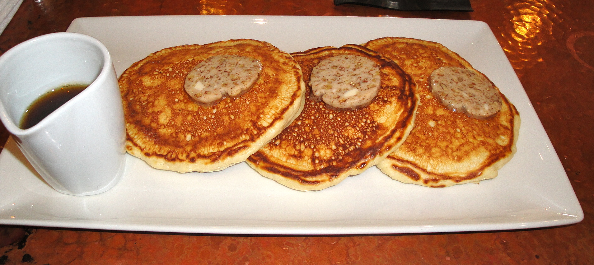 So I was determined to order eggs, and this went out the door when I saw ricotta pancakes with maple pecan butter on the menu. I was so glad with my choice. The pancakes were light, fluffy, and a beautiful golden-brown color. My roommate ordered a frittata (it kind of rhymes with ricotta!) that had pork shoulder, chorizo, potato, cheddar, and came with a side salad. It looked really good too.
