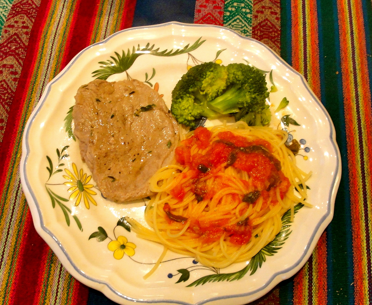 Tonight for dinner, I made veal with thyme in a lemon white wine sauce, spaghetti with homemade tomato sauce, and broccoli. Everything was really good, and I felt like I was in Italy without leaving my home. This is definitely an exaggeration, but I think you get the idea.
