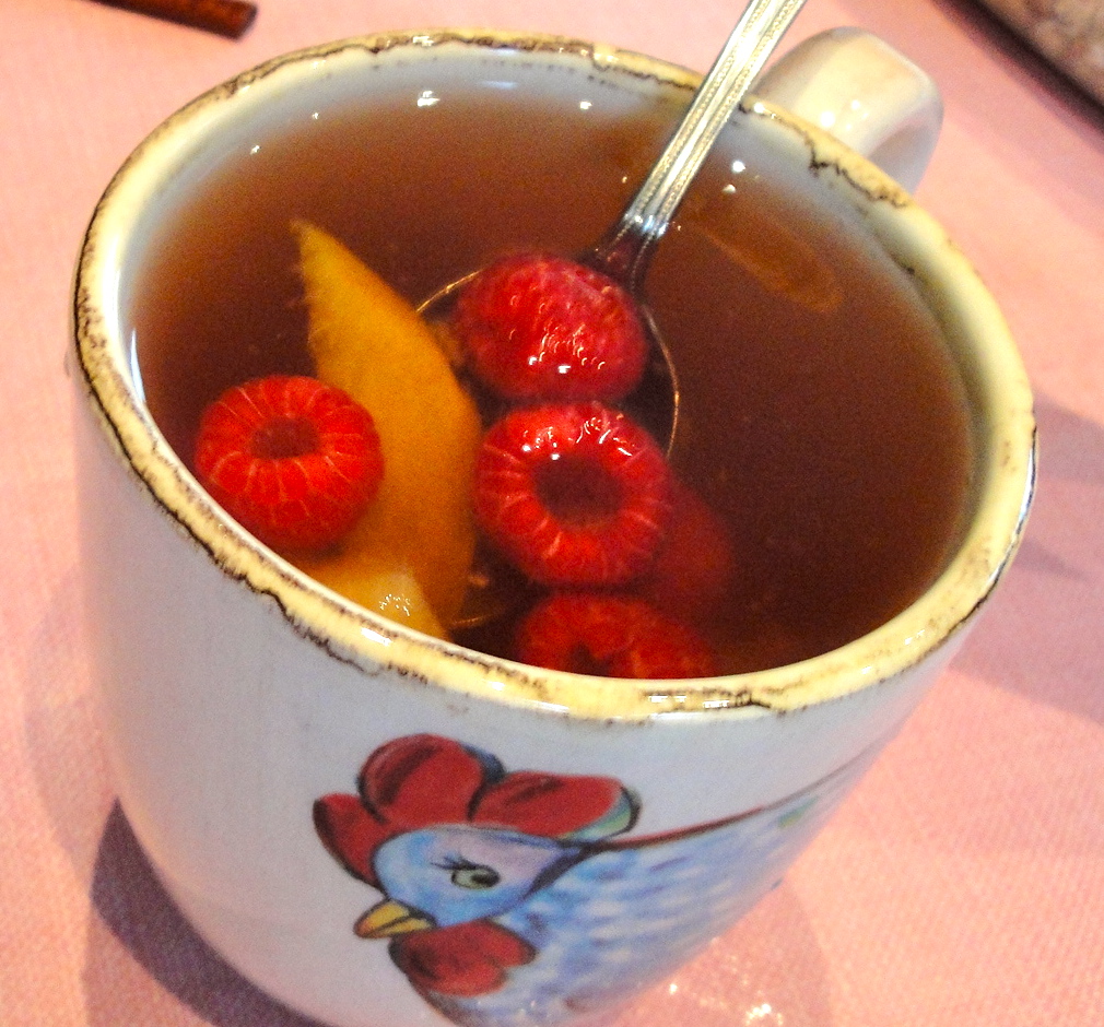I then poured my boiling water and slightly softened peach into my mug with tons of ice and a peach tea bag. I let my tea steep, but much to my dismay, my ice melted immediately, so I had to put more in. I would suggest first letting the tea cool and then adding the ice, so that the tea does not get too diluted. I also added fresh raspberries and honey. The tea was really delicious. I am cooled down and very satisfied now.