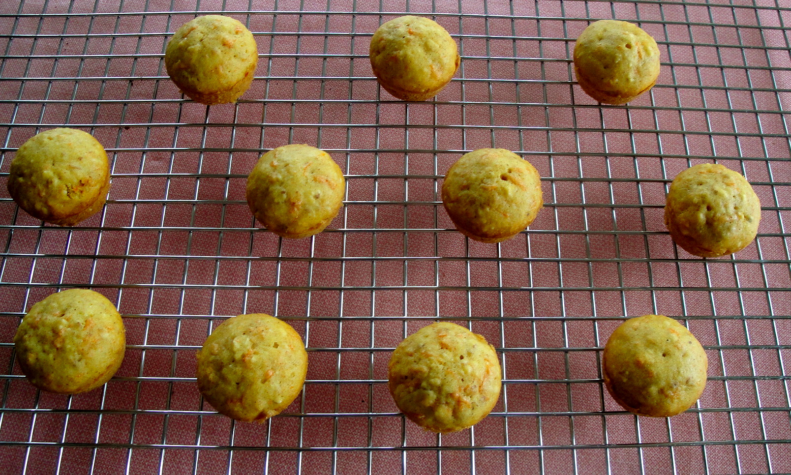 This gloomy weather put me in the baking mood, so I made mini carrot muffins. Because I already have cake in the house, I made only a dozen muffins (My yield was only 11 muffins which is fine too! This probably happened because the recipe I found was for 48 muffins and quartering every ingredient was not the easiest.)