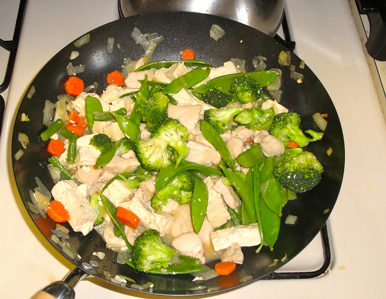 Here is my recipe and method of madness for chicken stir-fry. (This served 3 people, but it could serve 4 because my family eats a lot. You can always increase the vegetable and chicken amount).