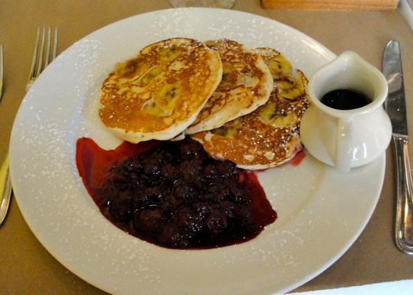Banana pancakes with fresh stewed blackberries and maple syrup