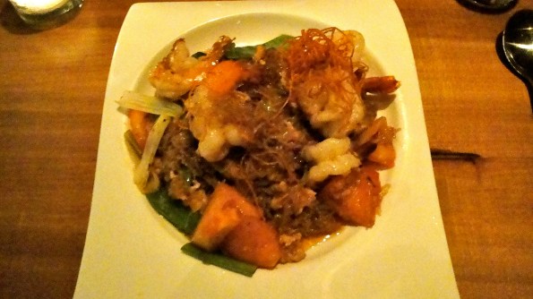 Thai glass noodles with shrimp, shredded chicken, cabbage, and chili paste