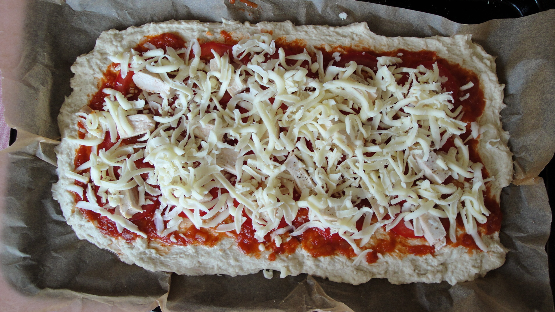 I put the dough onto a large parchemnt-lined sheet pan and flattened the dough with my hands to form the shape you see below. (I do not know how the pizza guys make their ever-so-fancy circular pie crusts). I decided to add grilled chicken breast (which I cut into bite-sized pieces), fresh tomato slices, and grated part skim mozzarella cheese to my pizza.