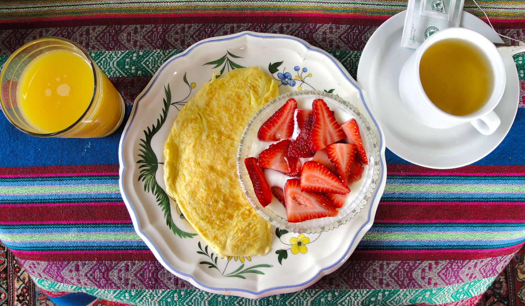 Omelet, yogurt with strawberries and honey, orange juice, and green tea. All I need are some blueberries (to get red, white, and blue in the shot)!