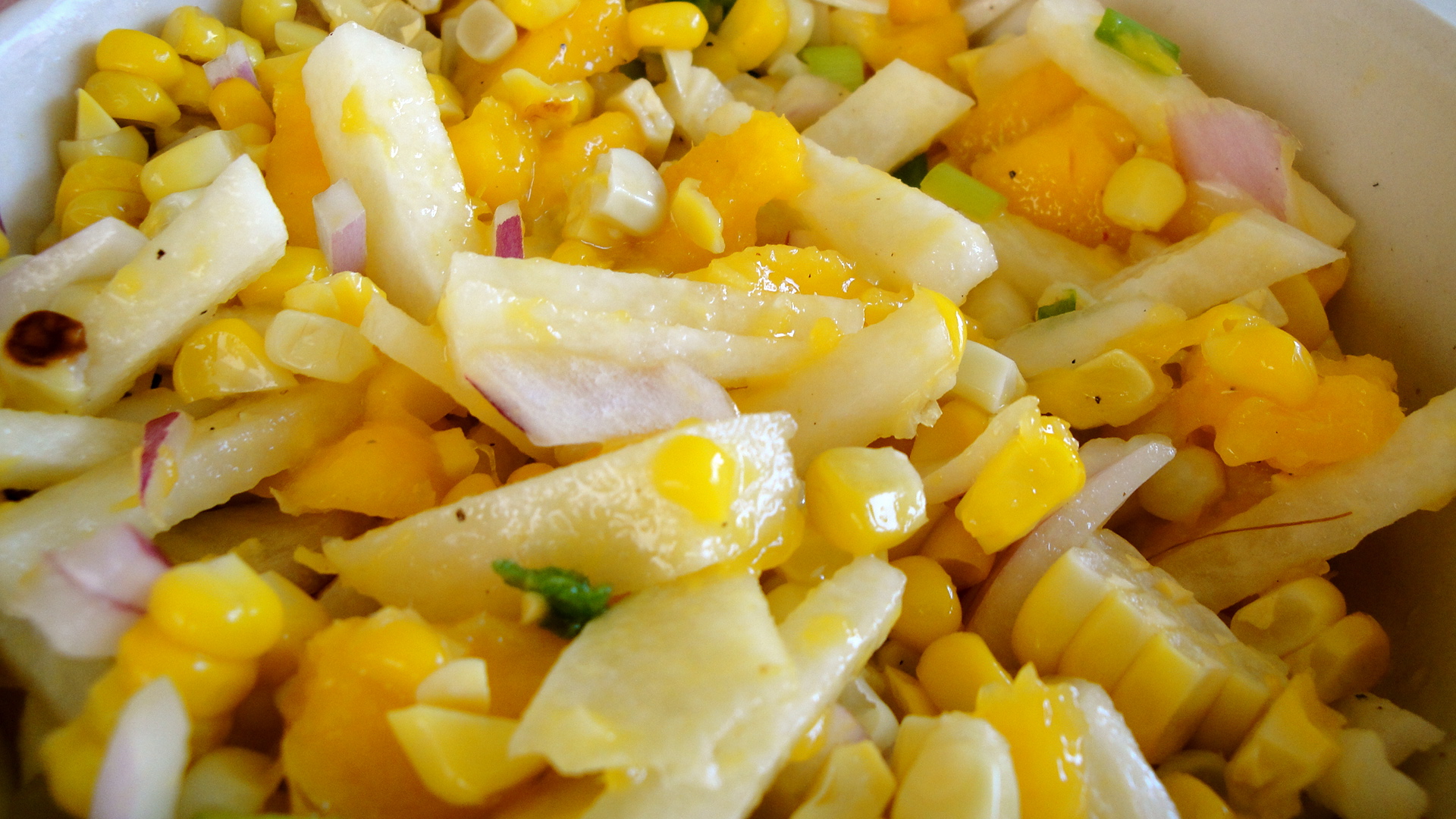 2) Meanwhile, in a bowl, combine mango, jicama, corn, red onion, scallion, the juice from 1/2 lime, orange juice, and a dash of salt and pepper.