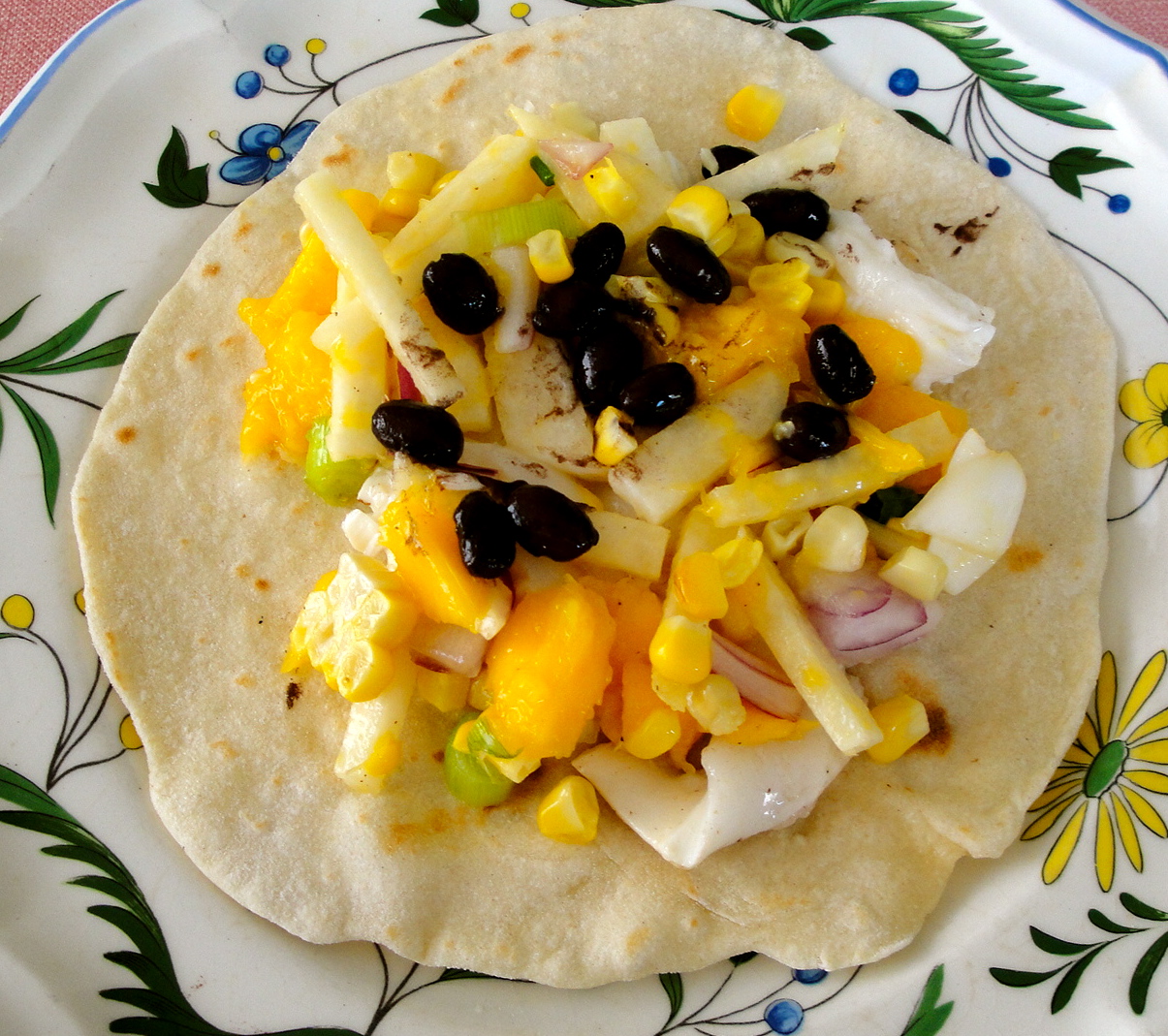 4) Divide fish accordingly and put in the tortillas. Serve with mango and jicama salsa, black beans, and leftover lime.