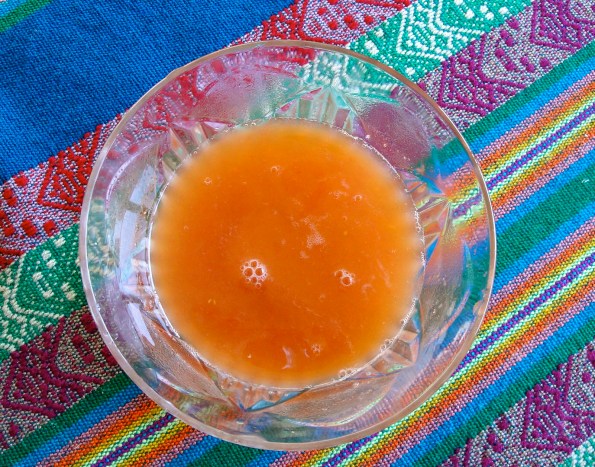 6) Pour tomato mixture in a medium sauce pan with chicken stock and squeezed tomato juice. Heat until hot.