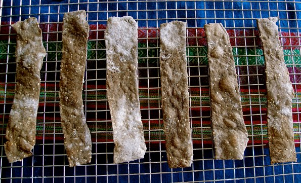 6) Put the rolled out dough strips onto a sheet pan lined with parchment paper. Bake for 4 minutes on one side. Flip and bake for another 2 minutes. (Cooking time can vary depending on the oven).