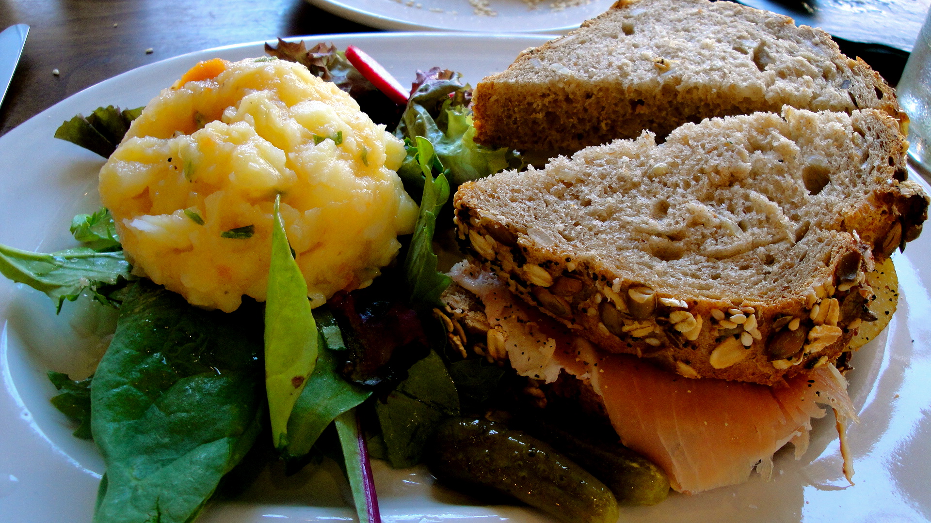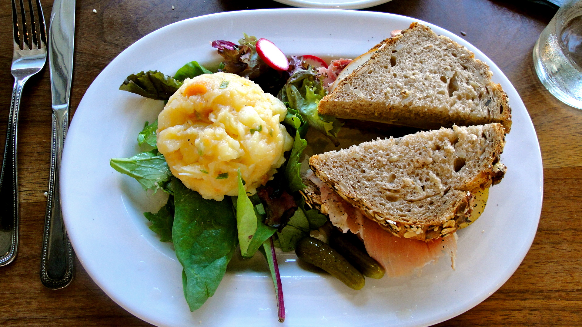 I then ordered a sandwich with black forest ham, smoked gouda, pear, and mustard on grain bread. The sandwich was absolutely delicious, and it came with a side of German potato salad, mixed greens, and cornichons (the only type of pickle I like).