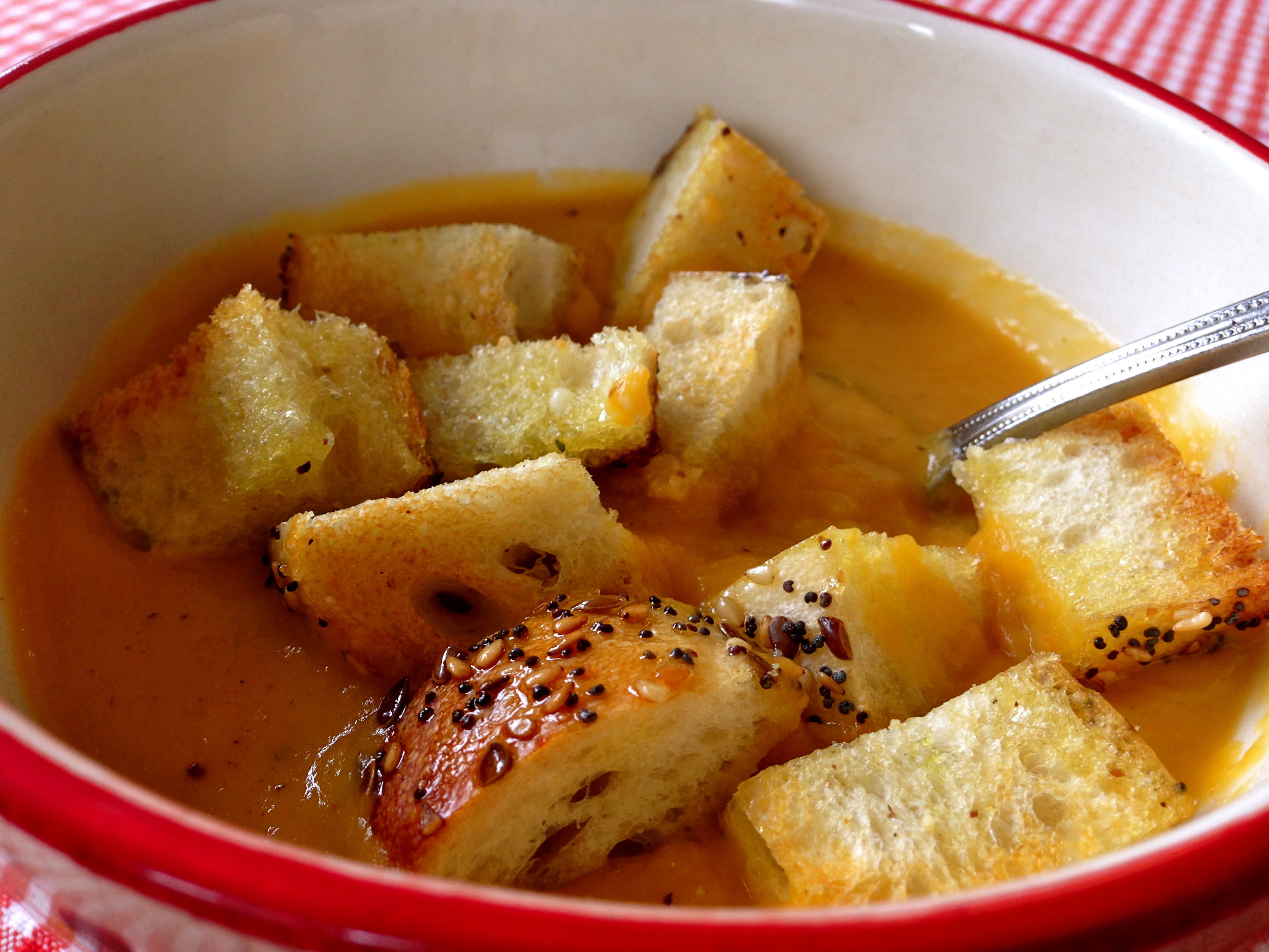 Butternut squash soup with seedy rosemary croutons. Tip: add a splash of pomegranate vinegar to butternut squash for a little zing. The vinegar really brightens up the soup!