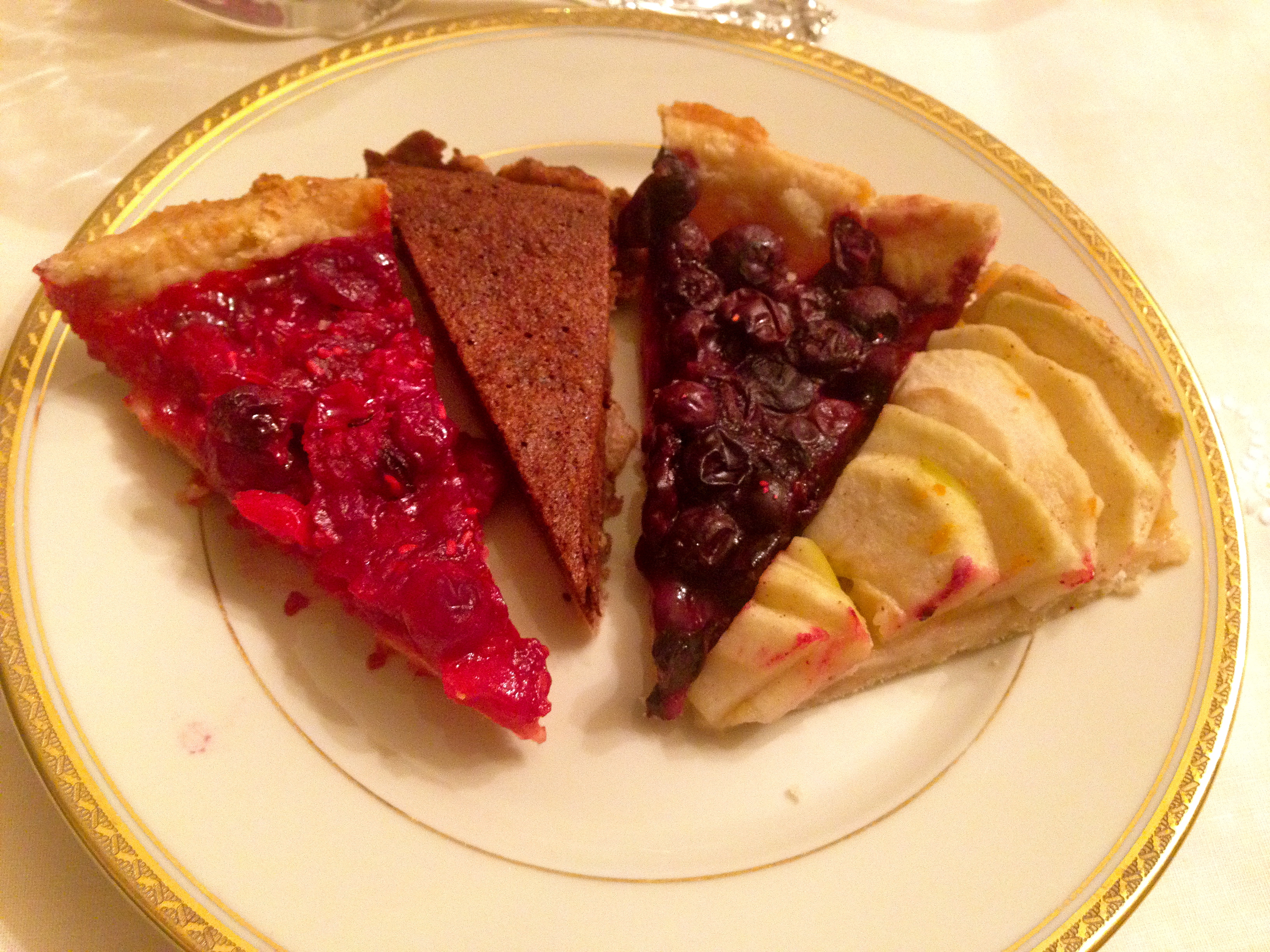 I really love cranberry sauce because I love tart things and decided to incorporate cranberries in my dessert this year. I added raspberries for sweetness and spiced up (or I really should say herbed up) my pie with a little chopped fresh rosemary. Seriously, the rosemary adds a nice kick. I winged the chocolate pie, adding cocoa powder and brown sugar to the pie dough and whipping up some egg whites and incorporating some melted dark chocolate. I will provide a recipe later.