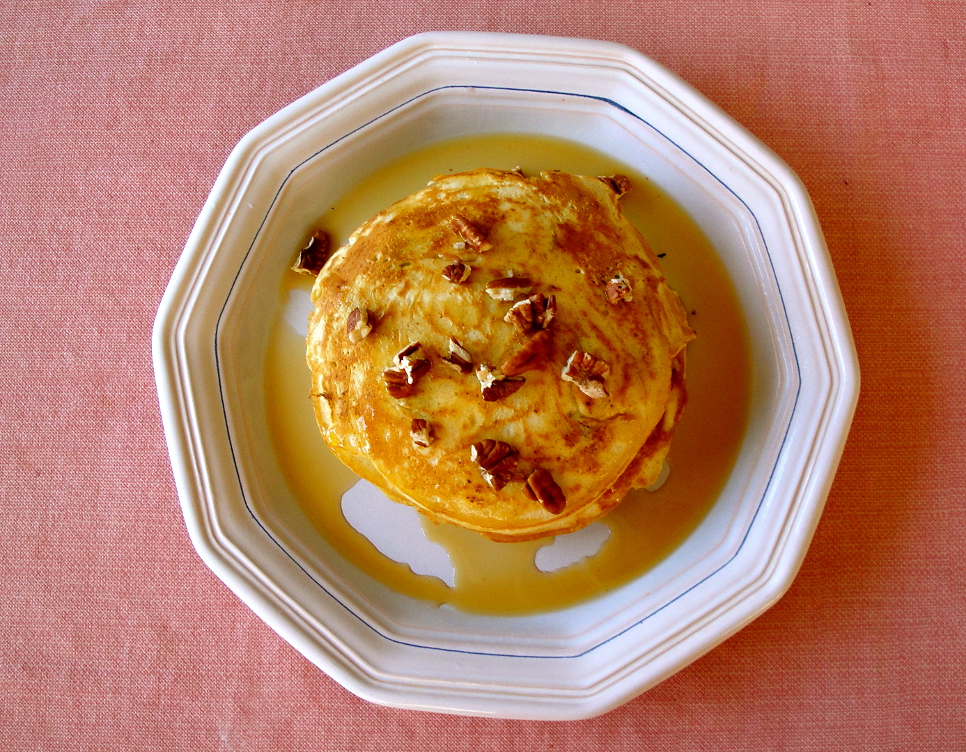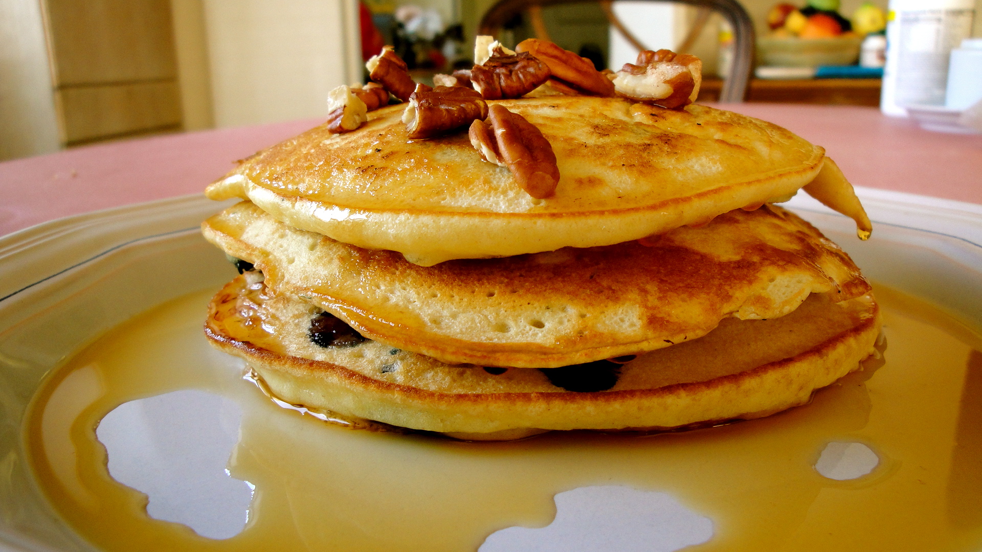 These pancakes were light, fluffy, a little tart, and overall awesome. I ate three of these this morning, which is even unusual for me (I usually eat two pancakes at one sitting), but I just couldn’t resist them. I followed the recipe from Simply Recipes, and I also added a small handful of toasted pecans on top of my pancakes. (All I did was put some pecans in a pan and toast them for a couple of minutes under low heat).