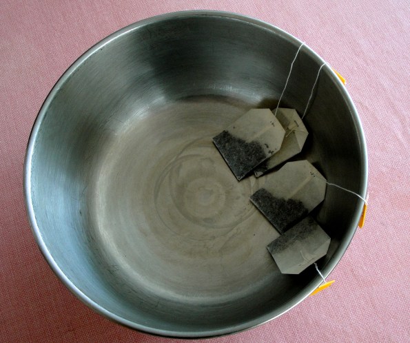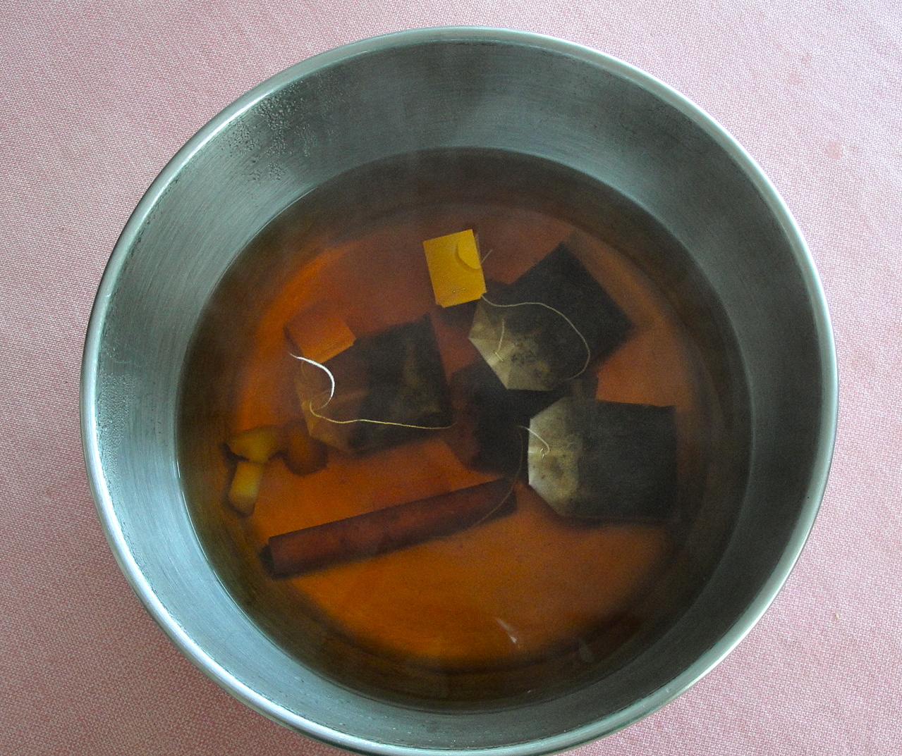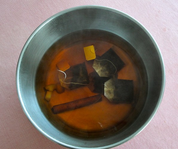 2) Put tea bags in heat-resistant bowl, and pour in hot water with ginger and cinnamon. (You might need to fish ginger and cinnamon out of kettle).