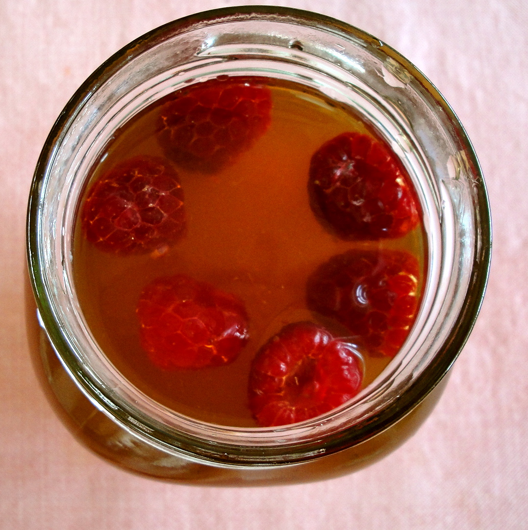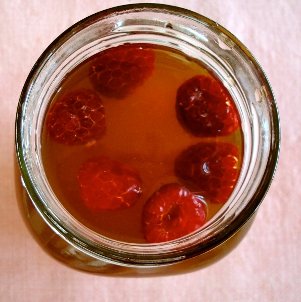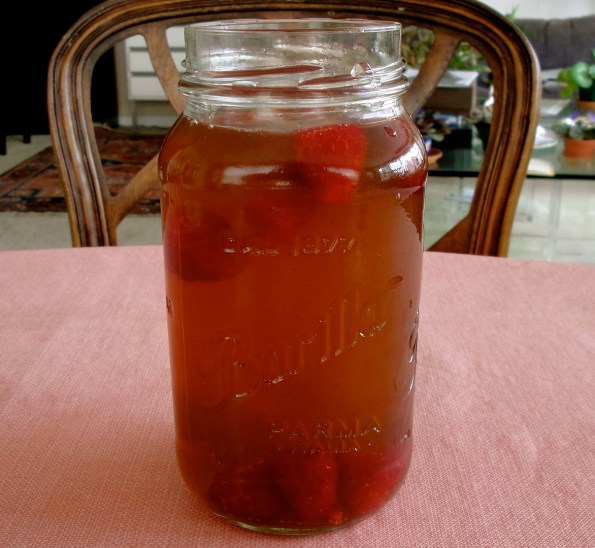 8) Once raspberries are frozen, put into glasses and fill glasses with tea. Add ice to chill tea even more.