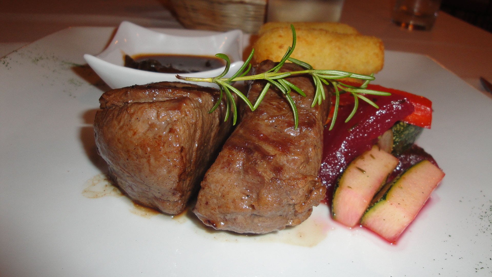 Grilled steak with potato croquettes and sautéed veggies, restaurant in Cusco