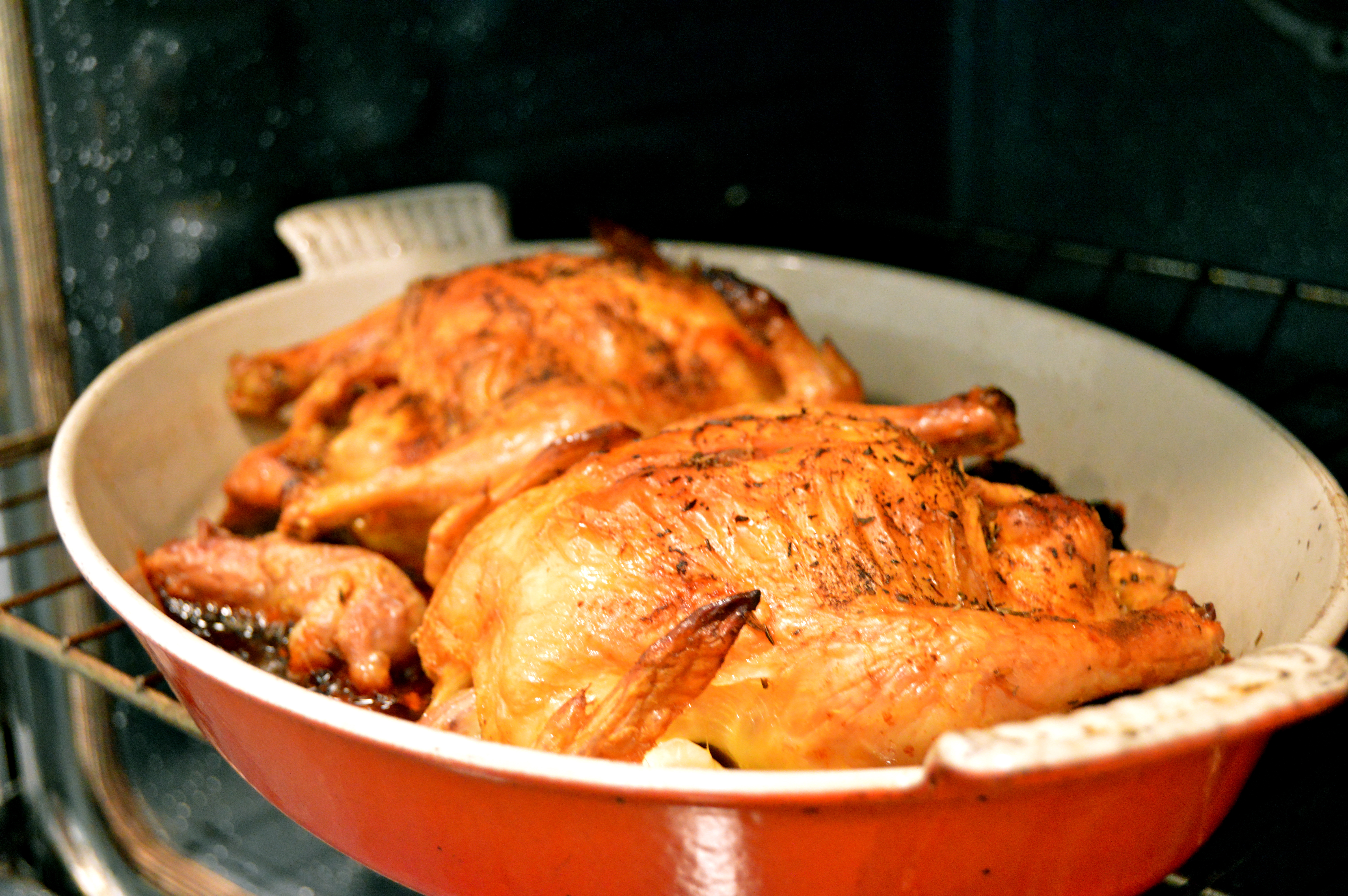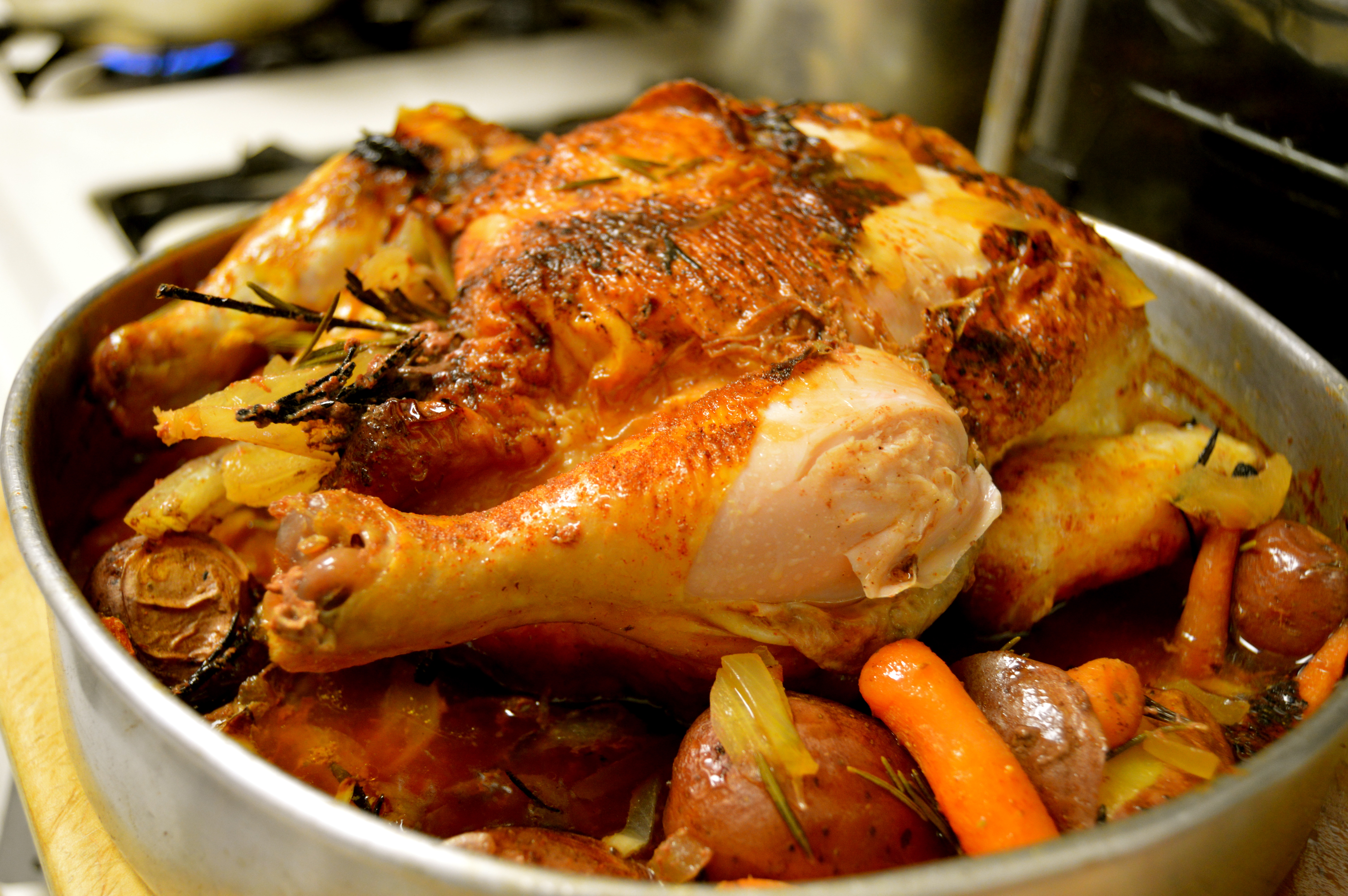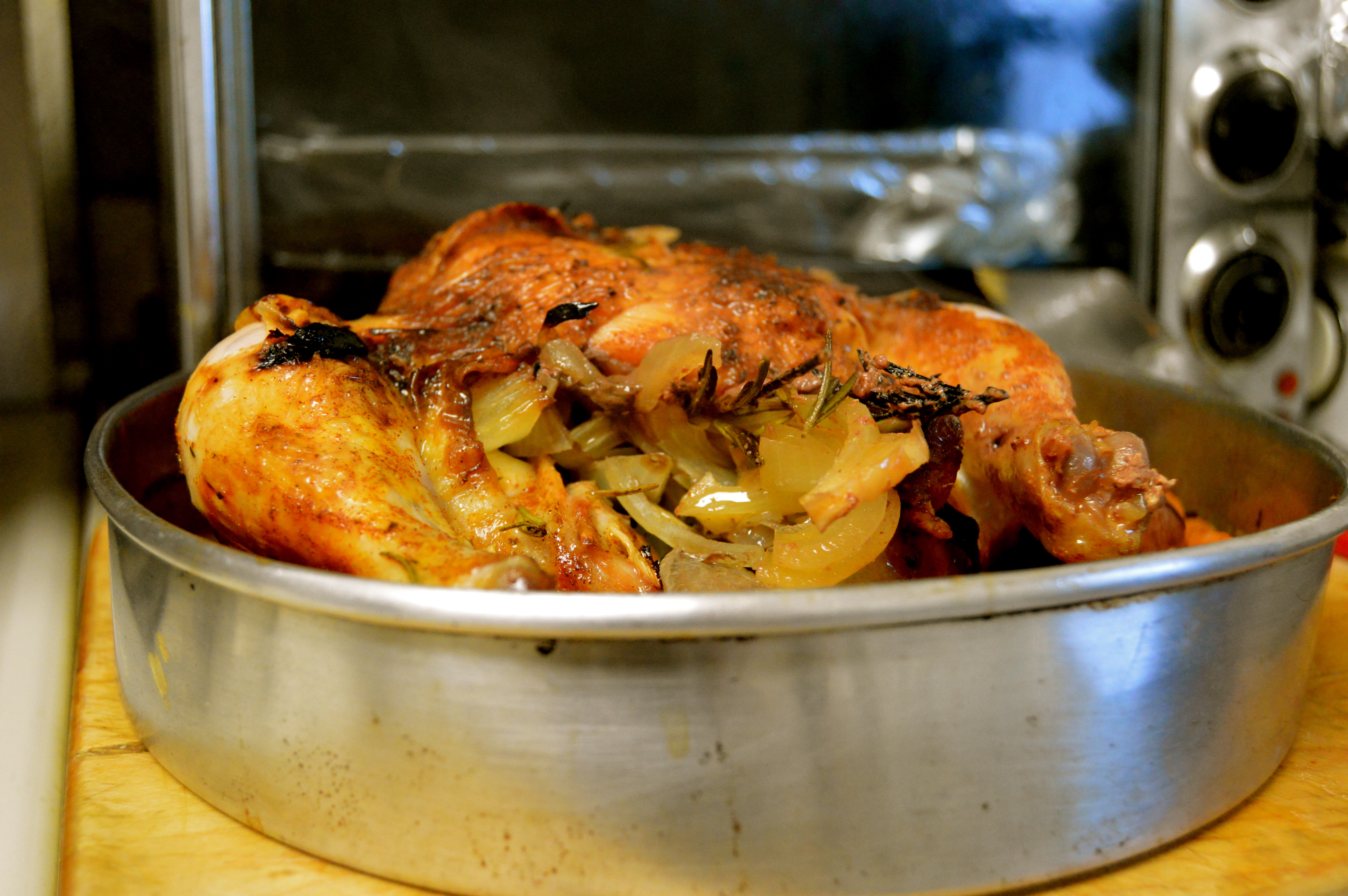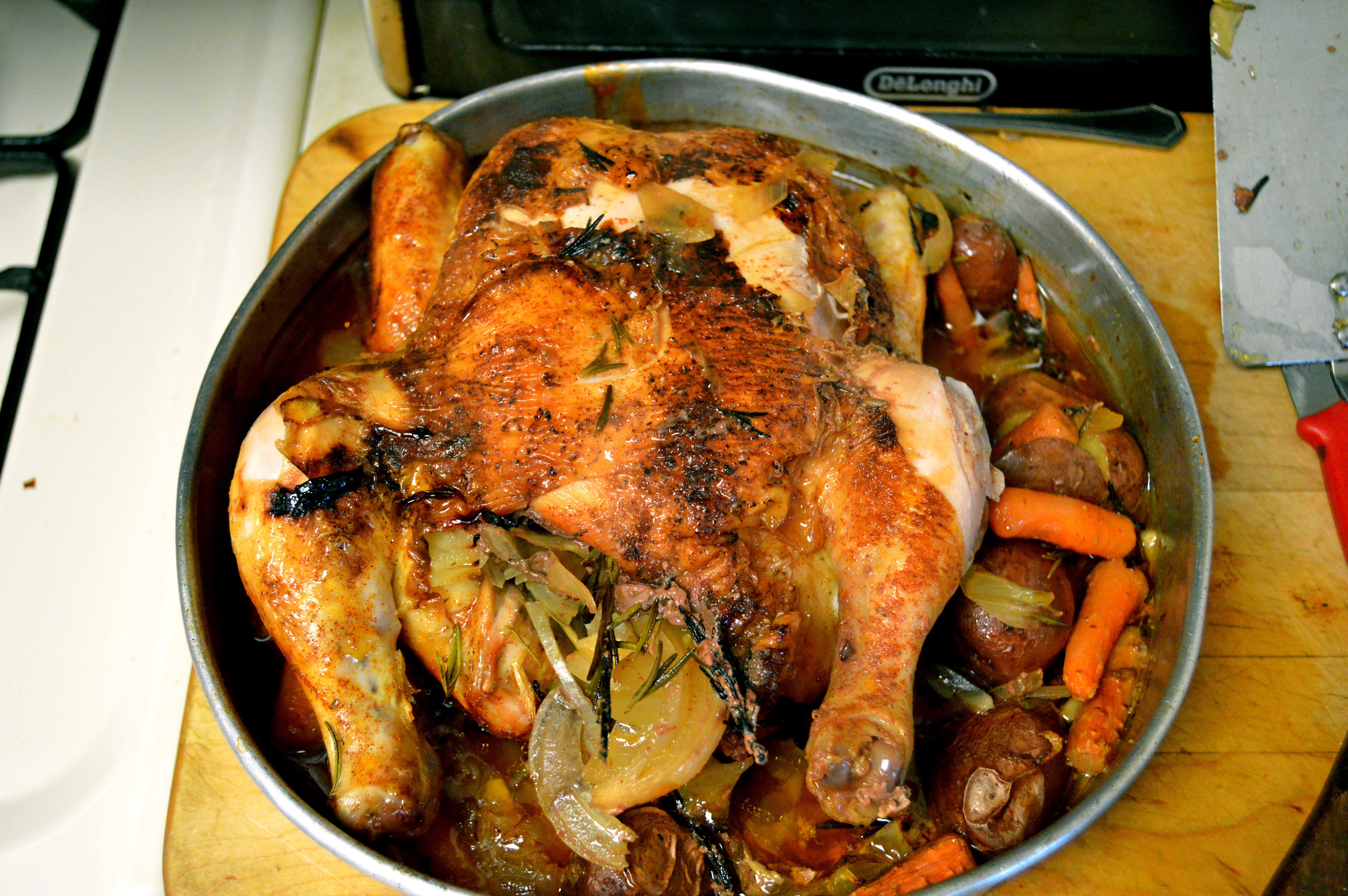 My mom made a roasted chicken for dinner tonight, which is my favorite thing she prepares. (Bad joke: why did I cross the road? To get to the other side to eat some of my mom’s succulent chicken!) Somehow, my mom manages to keep the chicken moist and juicy every time. Her trick is to add some chicken broth on top of the chicken and also in the cooking container (which is a cake pan). The cavity of the chicken is overflowing with onions and rosemary. The onions caramelize in the oven, giving the onions a soft and mild sweet taste. She also cooks little potatoes and carrots with the chicken (on the sides of the cake pan). I am so excited to eat the leftovers tomorrow!