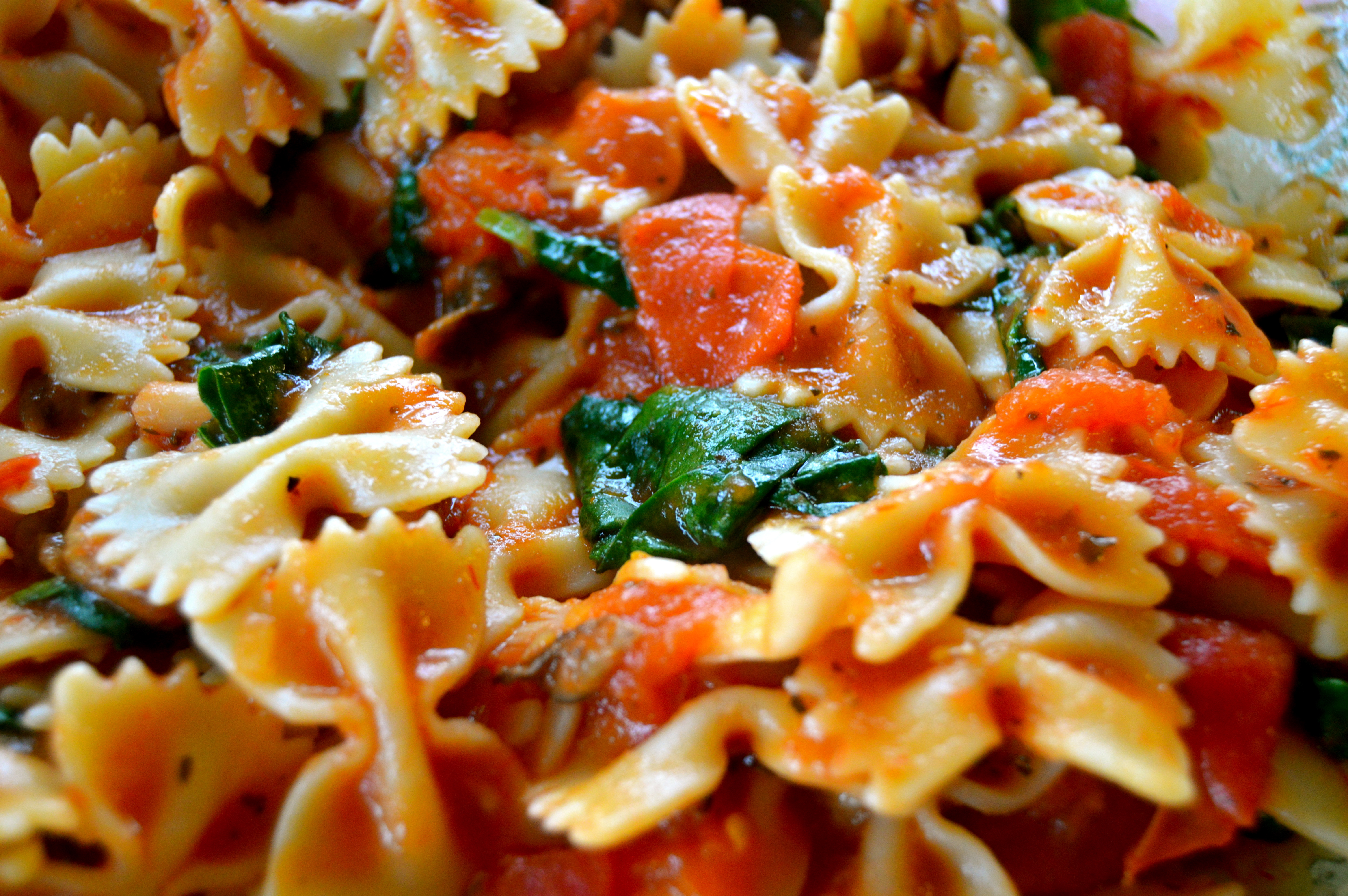Tonight, I wanted to try and use a pasta I rarely use but is still absolutely delicious – farfalle (also known as bow-tie pasta). Farfalle are so cute, and all of their ridges are great for holding pasta sauce. I was inspired by ingredients in my kitchen to make the dish described below. We had spinach, mushrooms, and tomatoes in the fridge, so I incorporated this with the farfalle. We also luckily had a bottle of opened Pinot Grigio, so I added this to the sauce. My parents and I enjoyed the farfalle with a glass of wine.