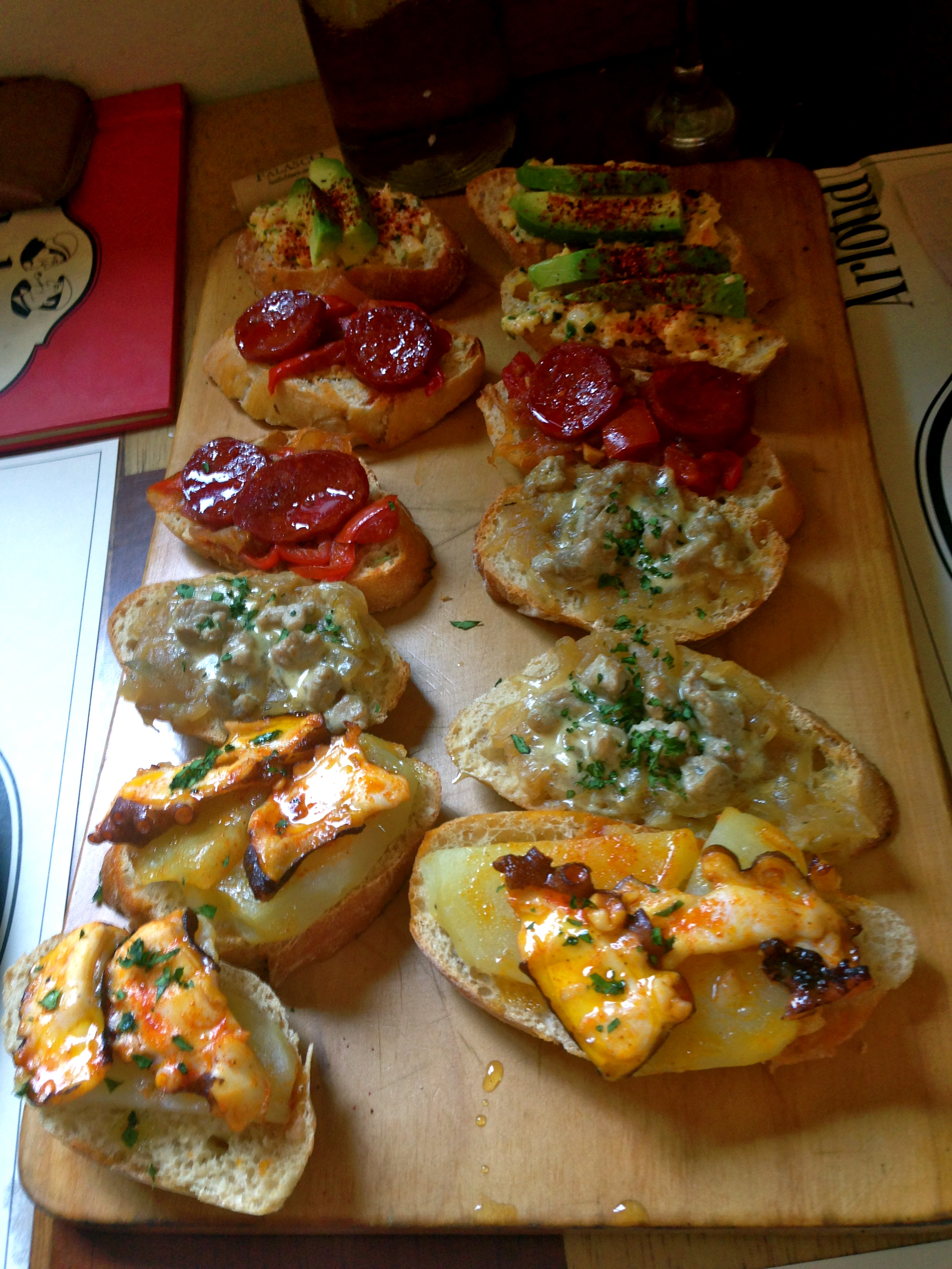 Tapas: octopus, eggplant, sausage, avocado and something else I am blanking on now (from closest to farthest), a quaint restaurant in the district of Barranco, Lima