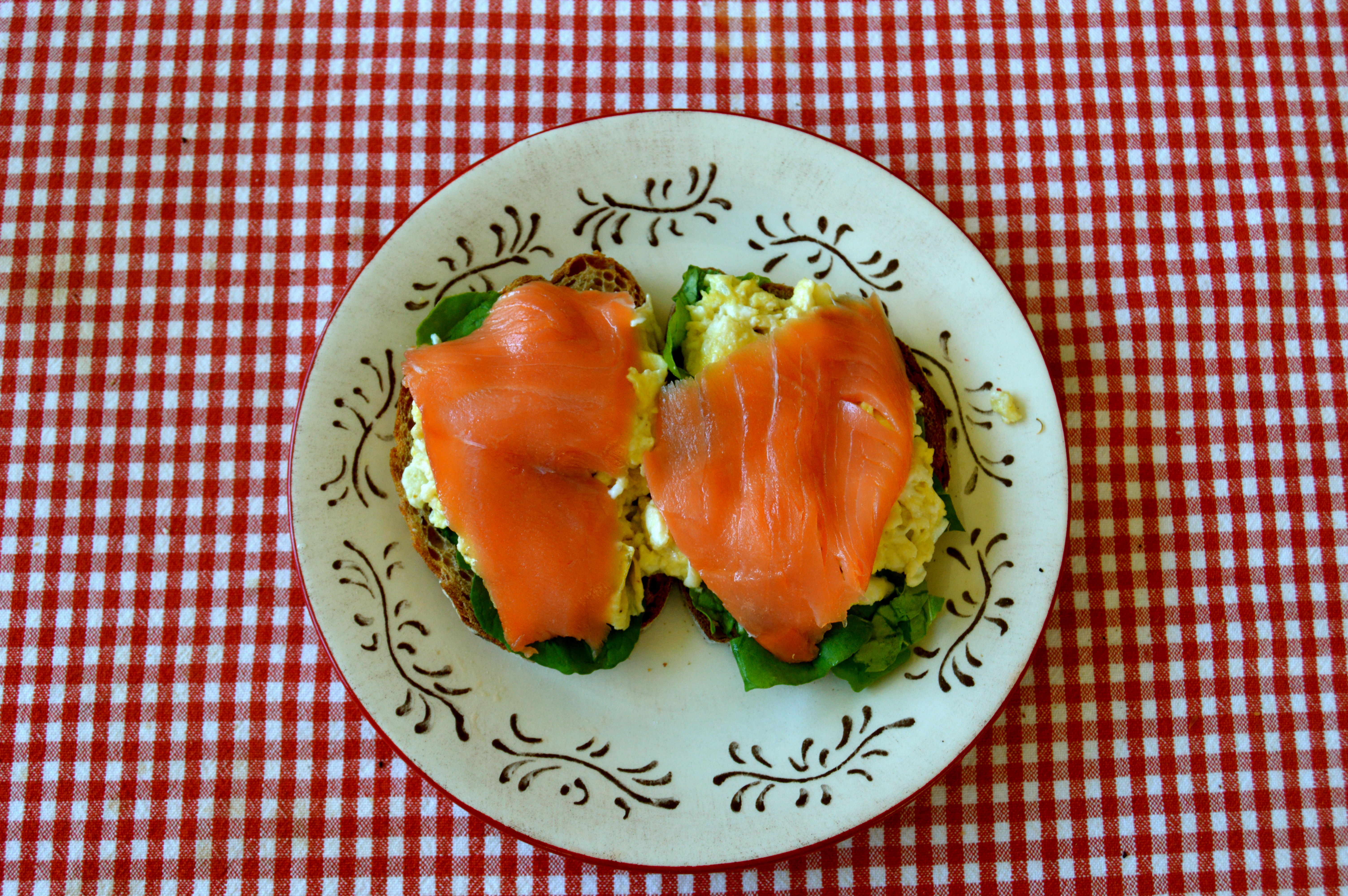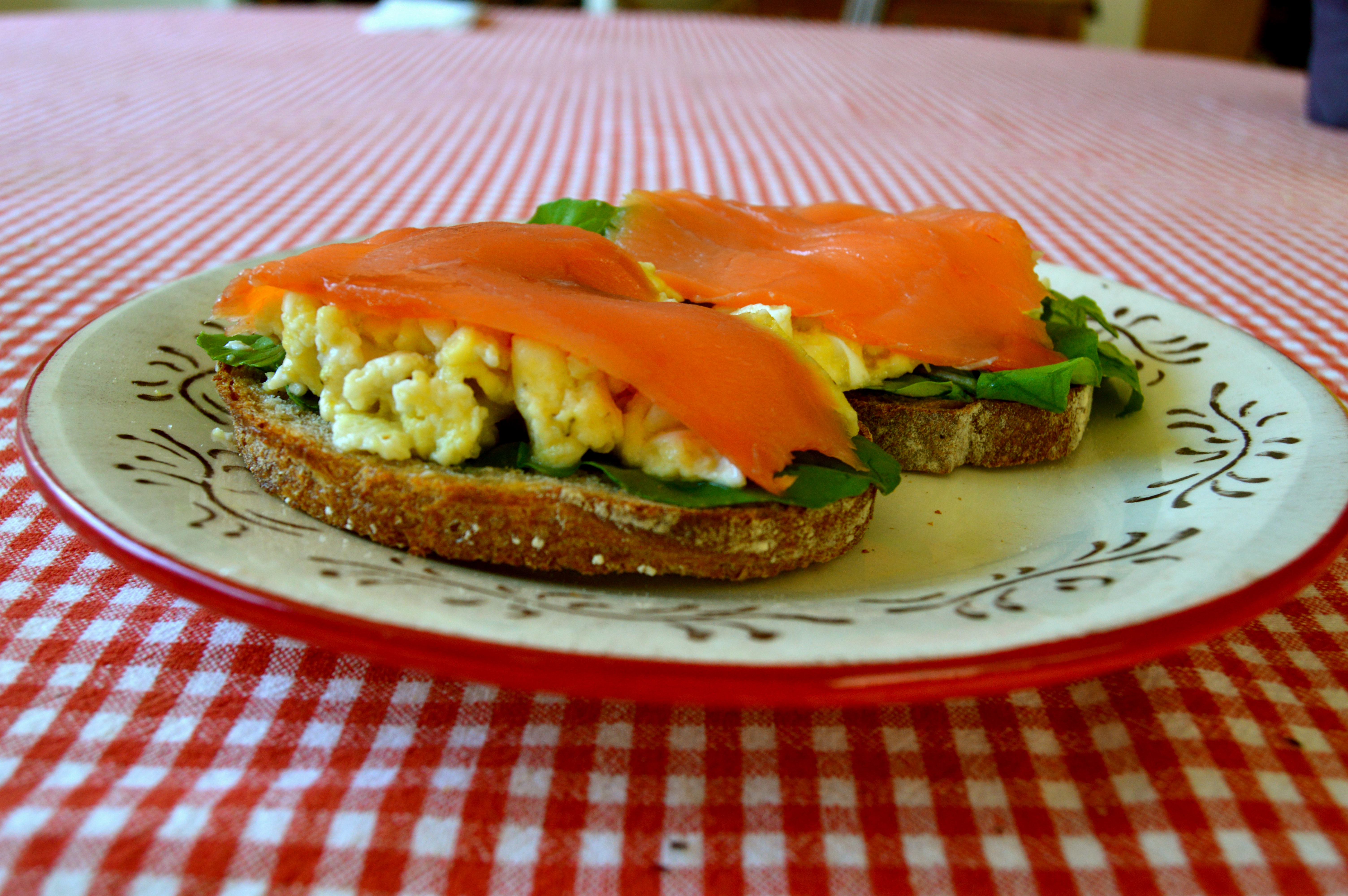 I have not been to Zabar’s since I came home from college, but I will be making my way there soon. My mom actually went to Zabar’s recently to buy some smoked salmon. Rather than eating smoked salmon with a bagel yesterday, I put some arugula on two slices of toasted whole wheat bread and added scrambled eggs and smoked salmon on top. For a surprising kick, I flavored the olive oil I cooked the eggs in with rosemary. (We have a lot of rosemary in the house if you couldn’t tell already from my most recent blog posts. To flavor the oil, cook a rosemary sprig under low heat in 1 teaspoon of olive oil for 1 minute and remove. Then add the eggs and scramble. Note: I did not add much salt to the eggs since I knew the smoked salmon is already salty).