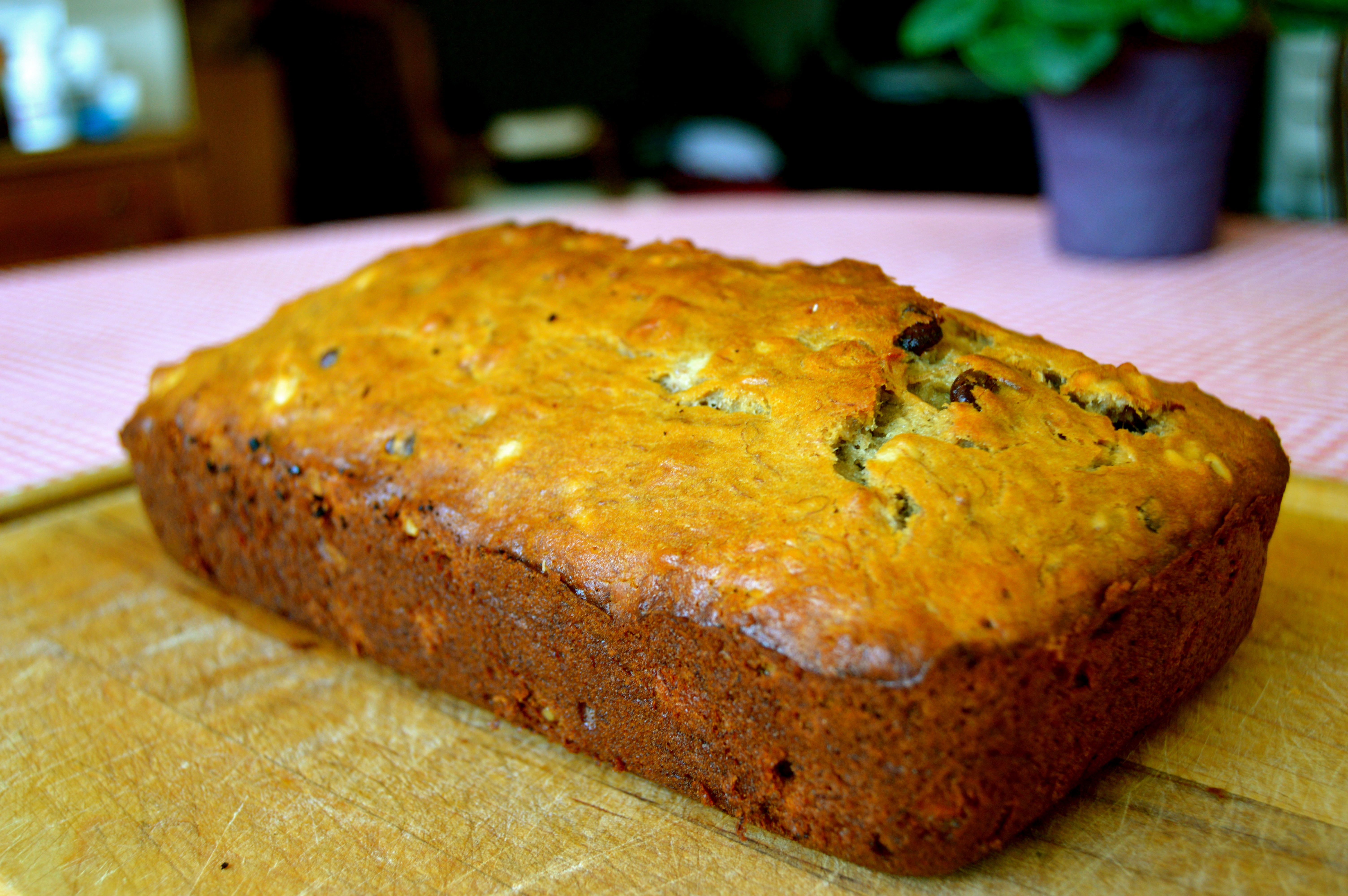 I love this walnut banana bread from the Food Network website. I have four modifications to the recipe: